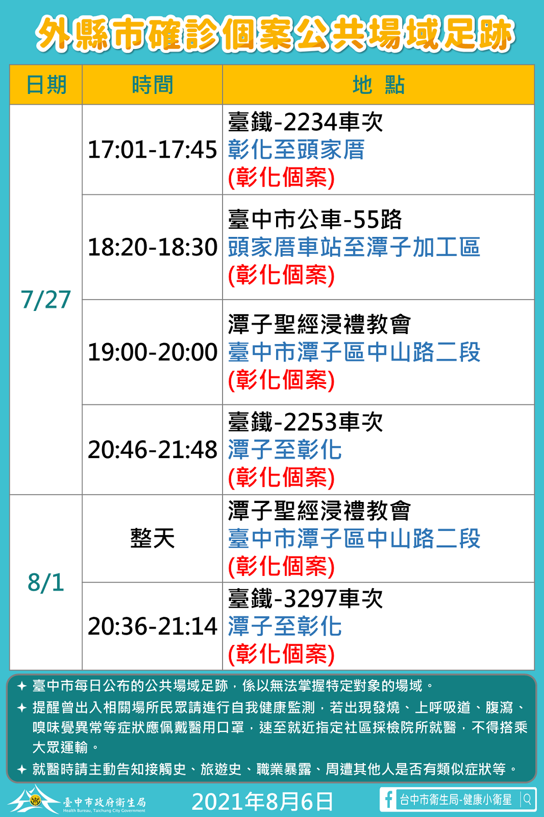 å½°å縣 çæ ç¾ æ°å¢ Tvbsæ°èç¶² from cc.tvbs.com.tw 彰化縣 21 日共有 5 例新增的本土案例,衛生局公布最新確診者足跡圖,其中包含在 14 日晚間曾在板橋搭乘高鐵到高雄市左營(861 車次第 8 車廂)。 另外,確診者在 16 日也曾到全國電子、nike、愛迪達等店家消費;也有人在 13~17 日間也曾到員林市百果山四百崁.